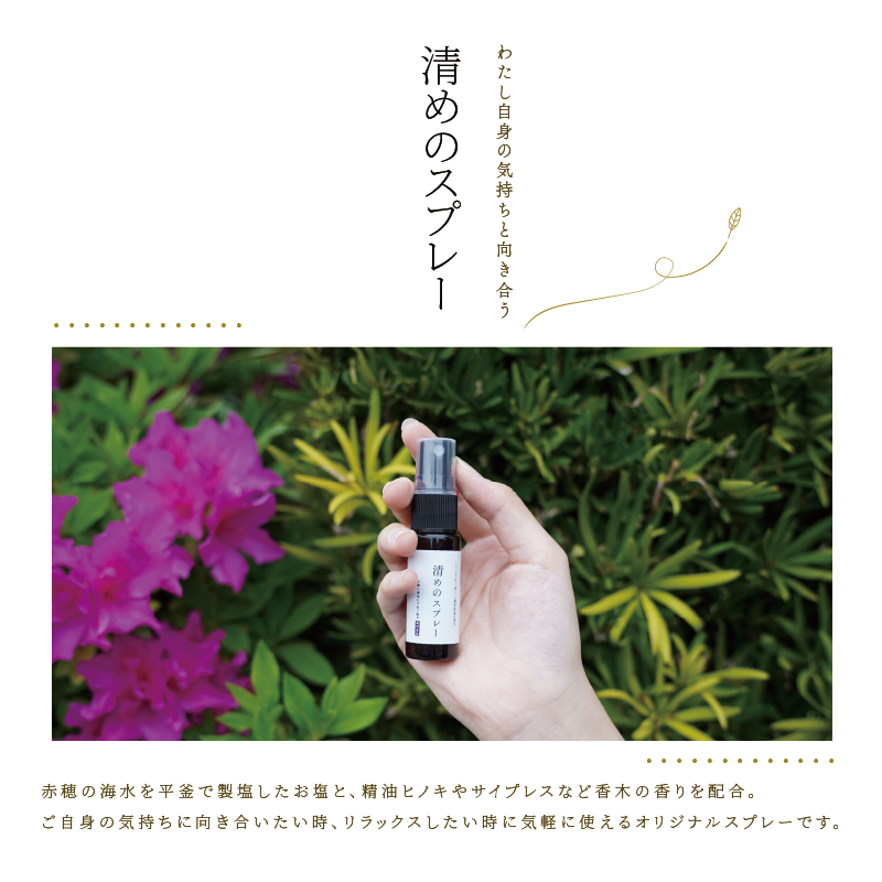 赤穂の海水を平釜で製塩したお塩、精油、ヒノキやサイプレスなど香木の香りを配合。リラックスしたい時、ご自身の気持ちに向き合いたい時にお使いください。
